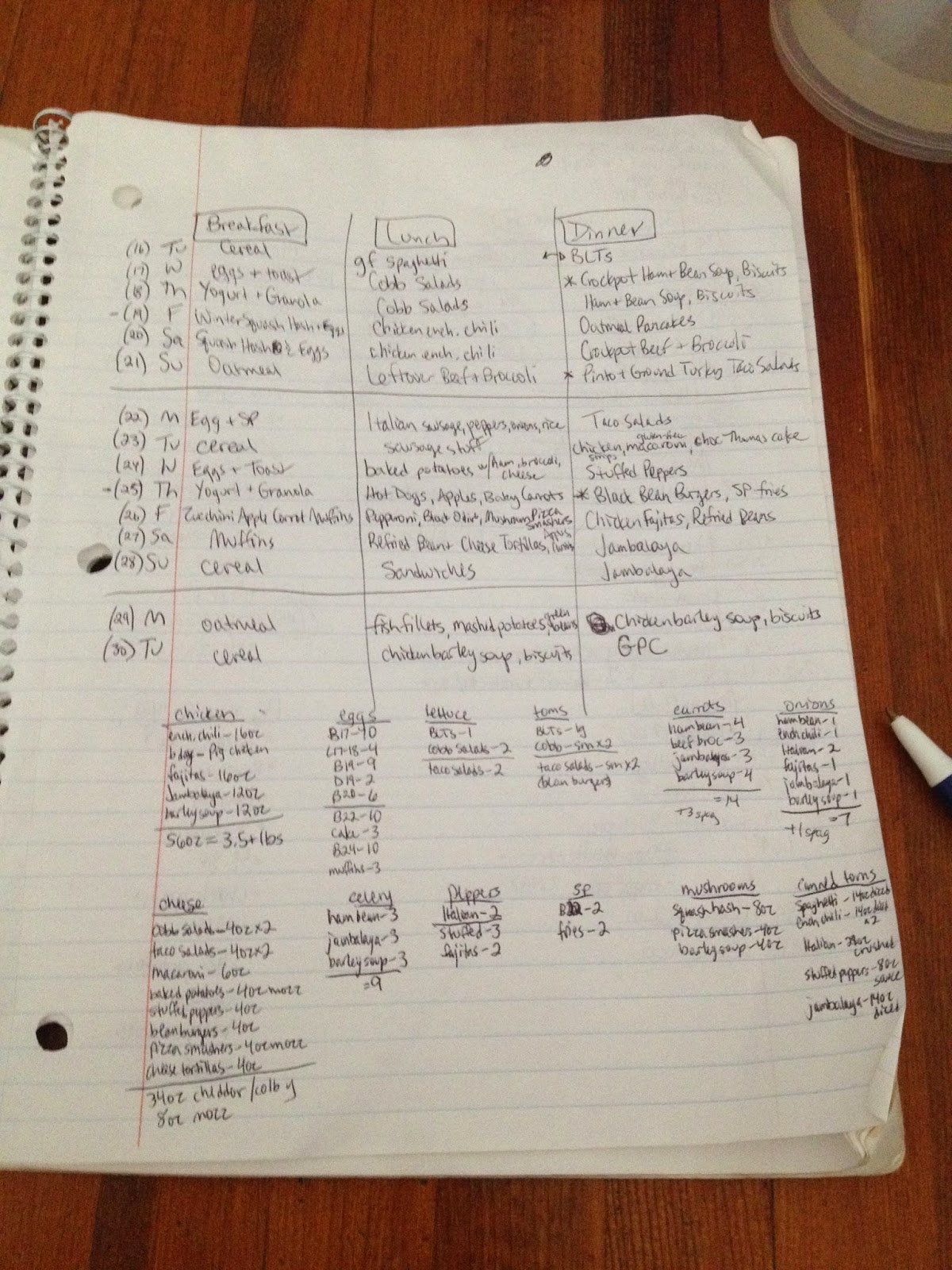 It’s complicated, yes. It’s not fancy and electronic, but I’m definitely a pen and paper list girl. But this is what works for me. It means we have food for every day planned out, plus the same rotation of snacks we usually have around. It means I know what has to be done, and when. And it saves my sanity when I can’t remember where I put my shoes, much less how much cheese is supposed to be in tonight’s dinner.