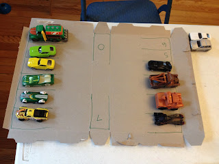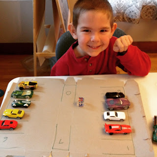 Like today. The prep for this was really easy: I flattened out a cereal box and drew parking spaces. 1-6 were on each side, and 0 and 7 were in the middle. He was able to play three games with this board, 12 vehicles, and a die.